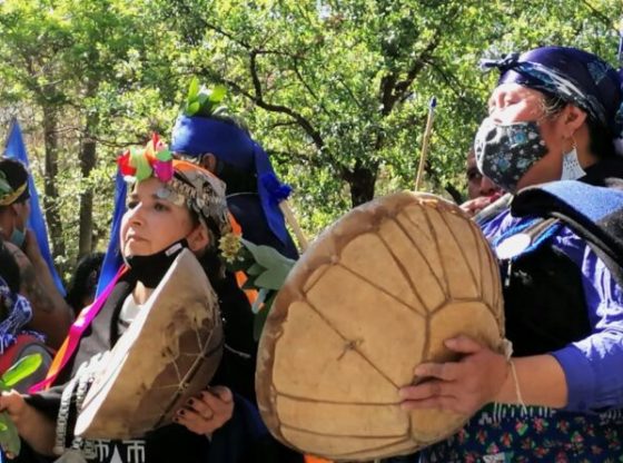 Mapuche-protest in Chili, met borden in hun taal, ter verdediging van hun recht op culturele onafhankelijkheid en landterugwinning (credit foto: Pressenza International News Agency, https://www.pressenza.com/)