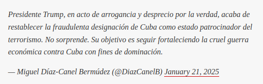 – Miguel Díaz-Canel Bermúdez (@DiazCanelB) 21 januari 2025